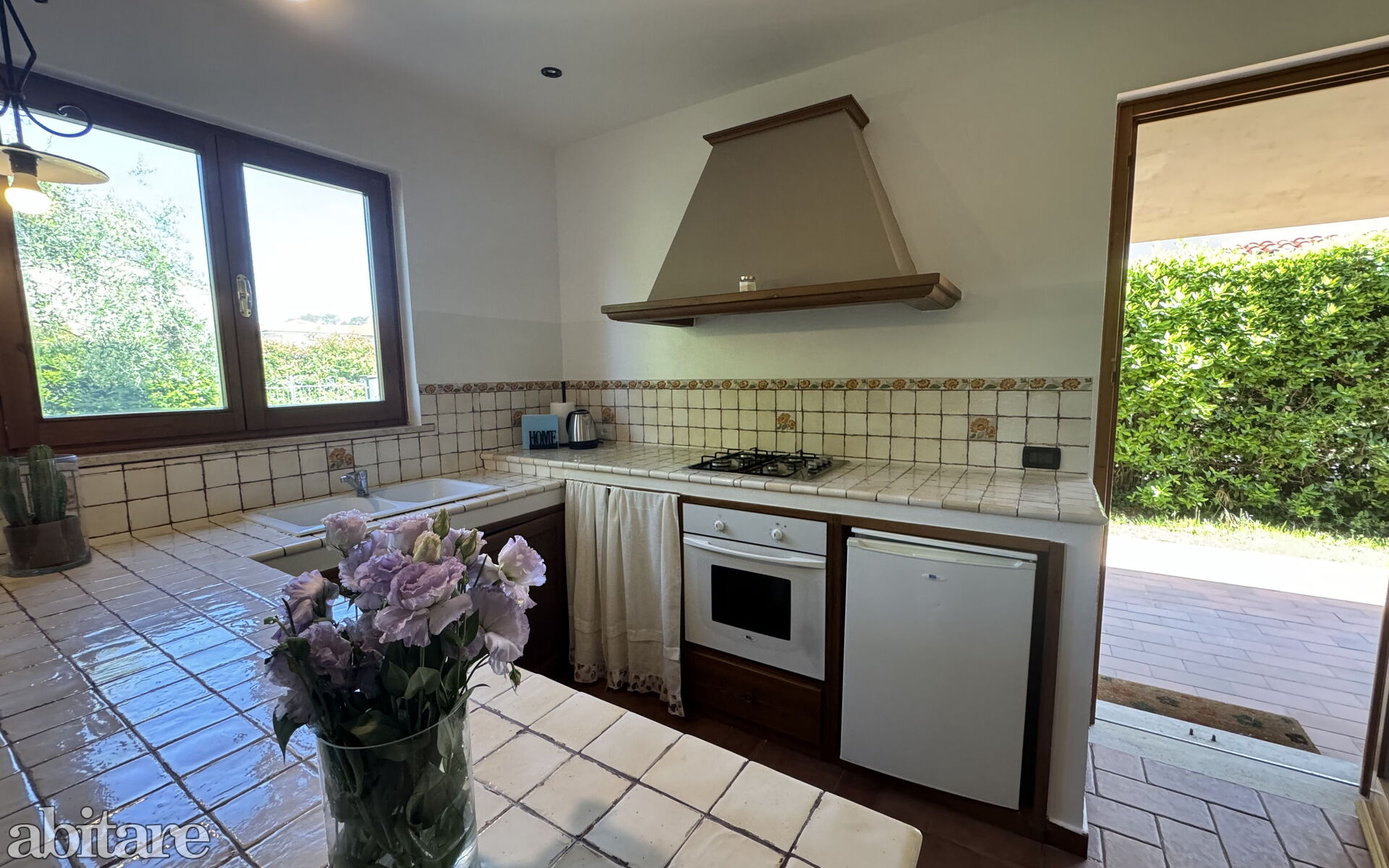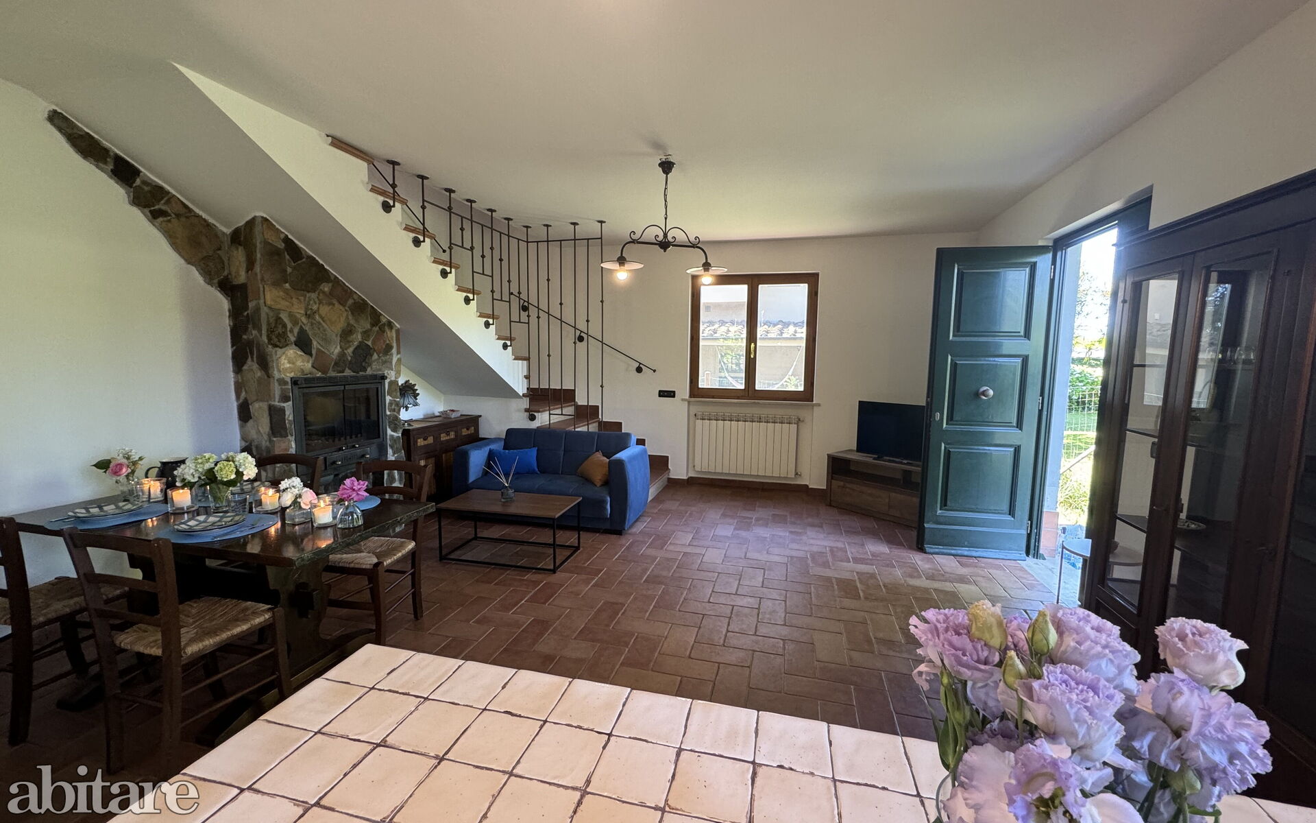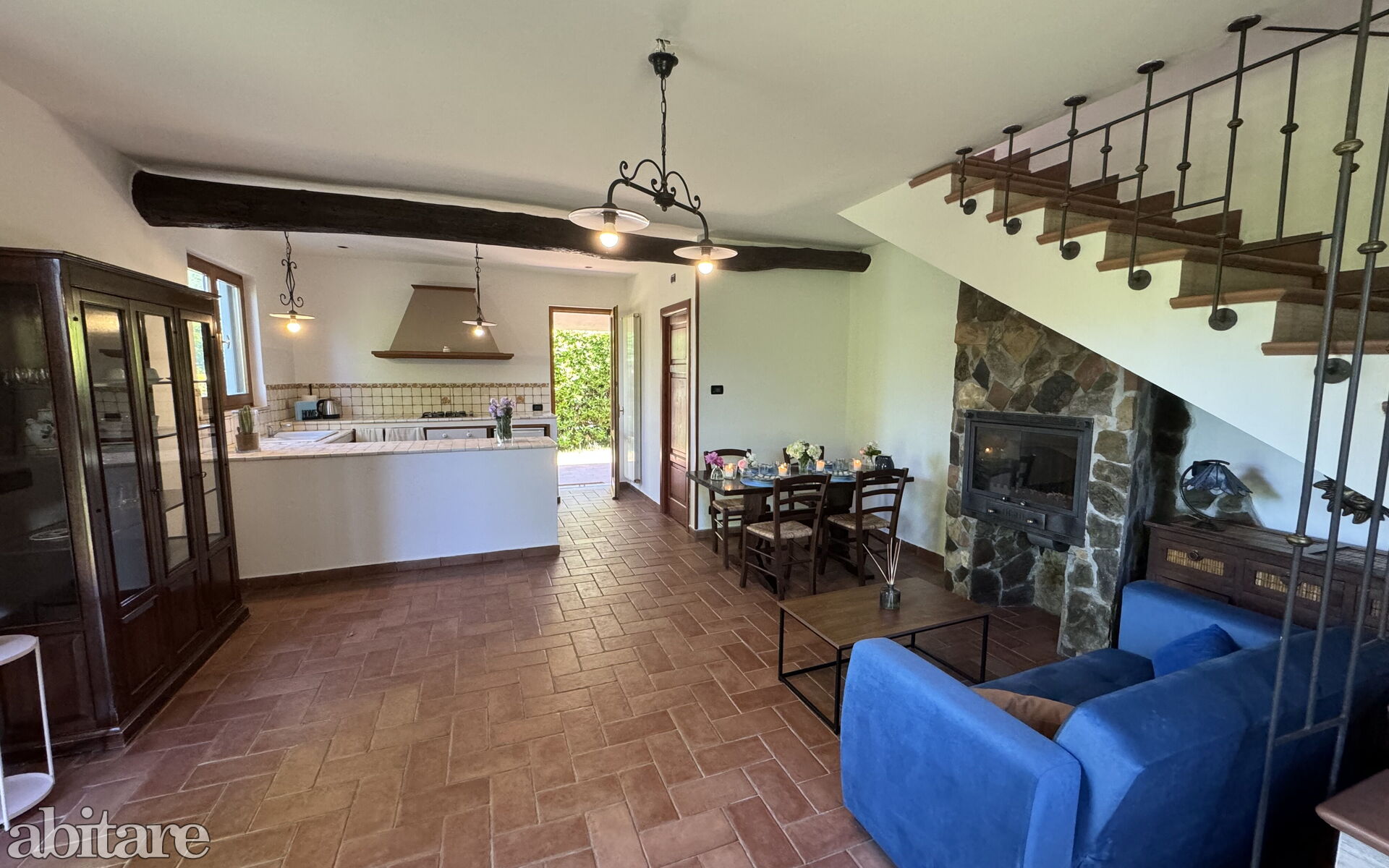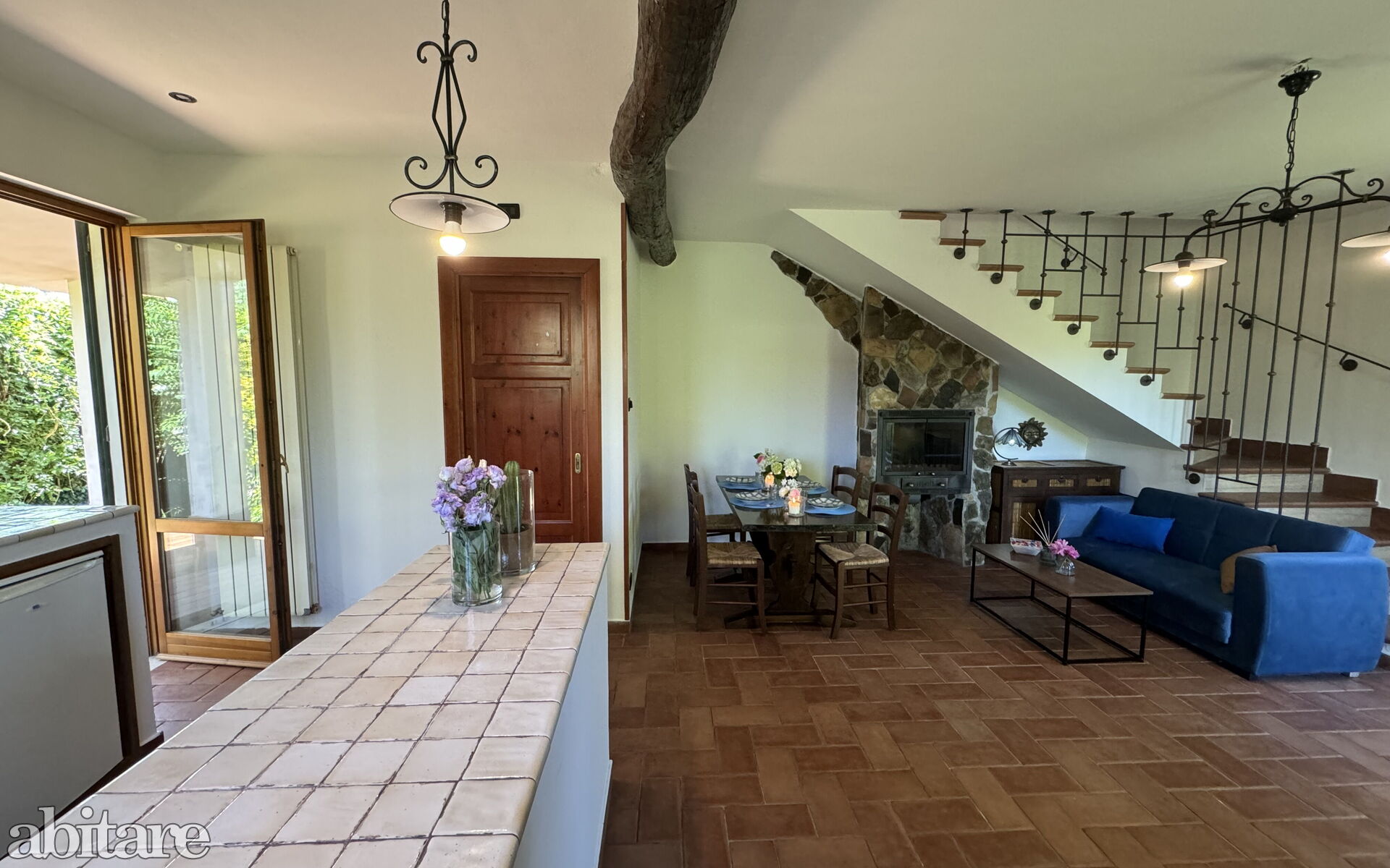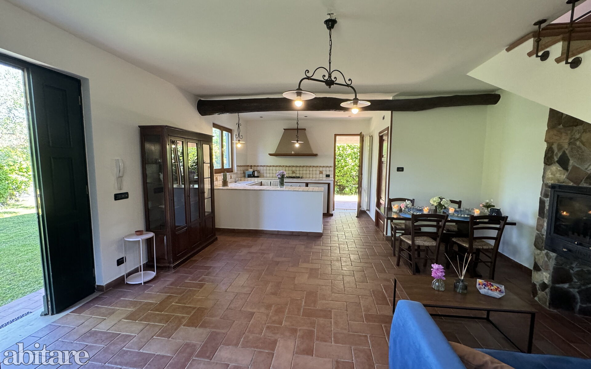 The house is composed of: on the ground floor, spacious living room with dining table, sofa, TV, fireplace, kitchenette with central island, stove, oven, small fridge with freezer cell, exit to the garden and to the veranda with table and chairs to dine outside, utility room with washing machine, 1 service bathroom with toilet and basin.