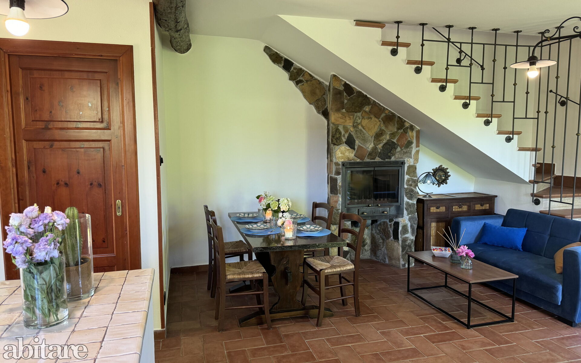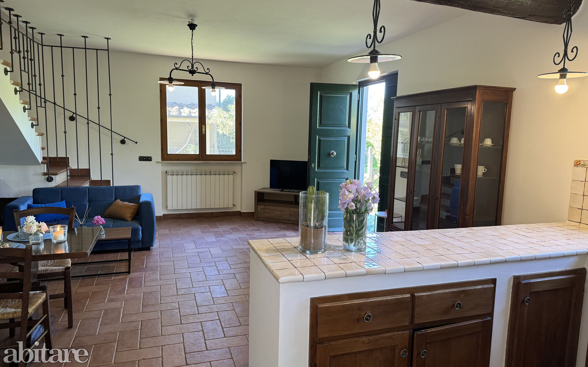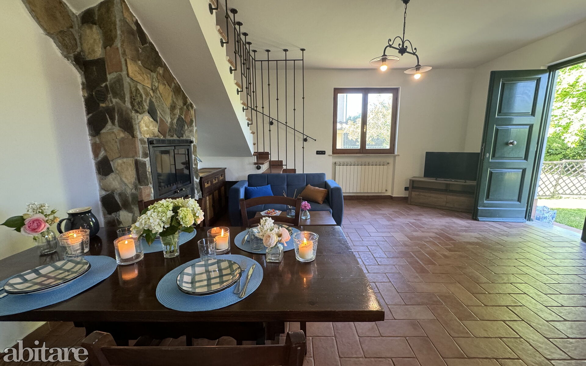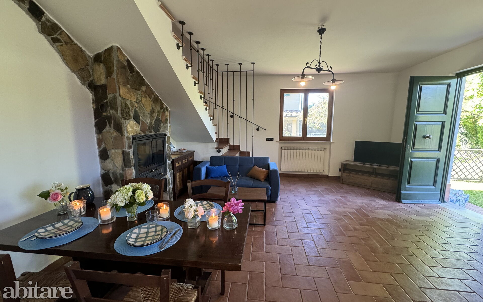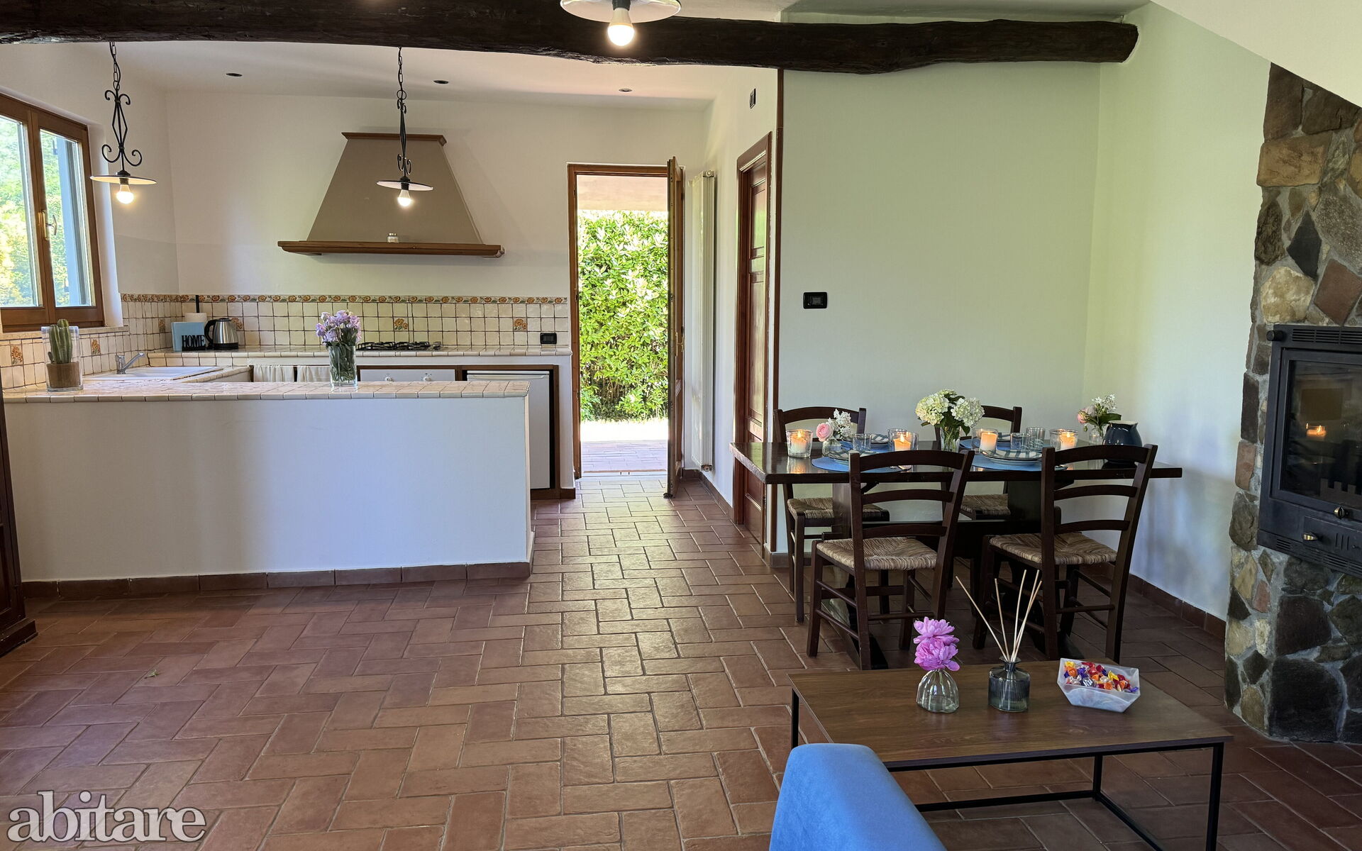 The house is composed of: on the ground floor, spacious living room with dining table, sofa, TV, fireplace, kitchenette with central island, stove, oven, small fridge with freezer cell, exit to the garden and to the veranda with table and chairs to dine outside, utility room with washing machine, 1 service bathroom with toilet and basin.