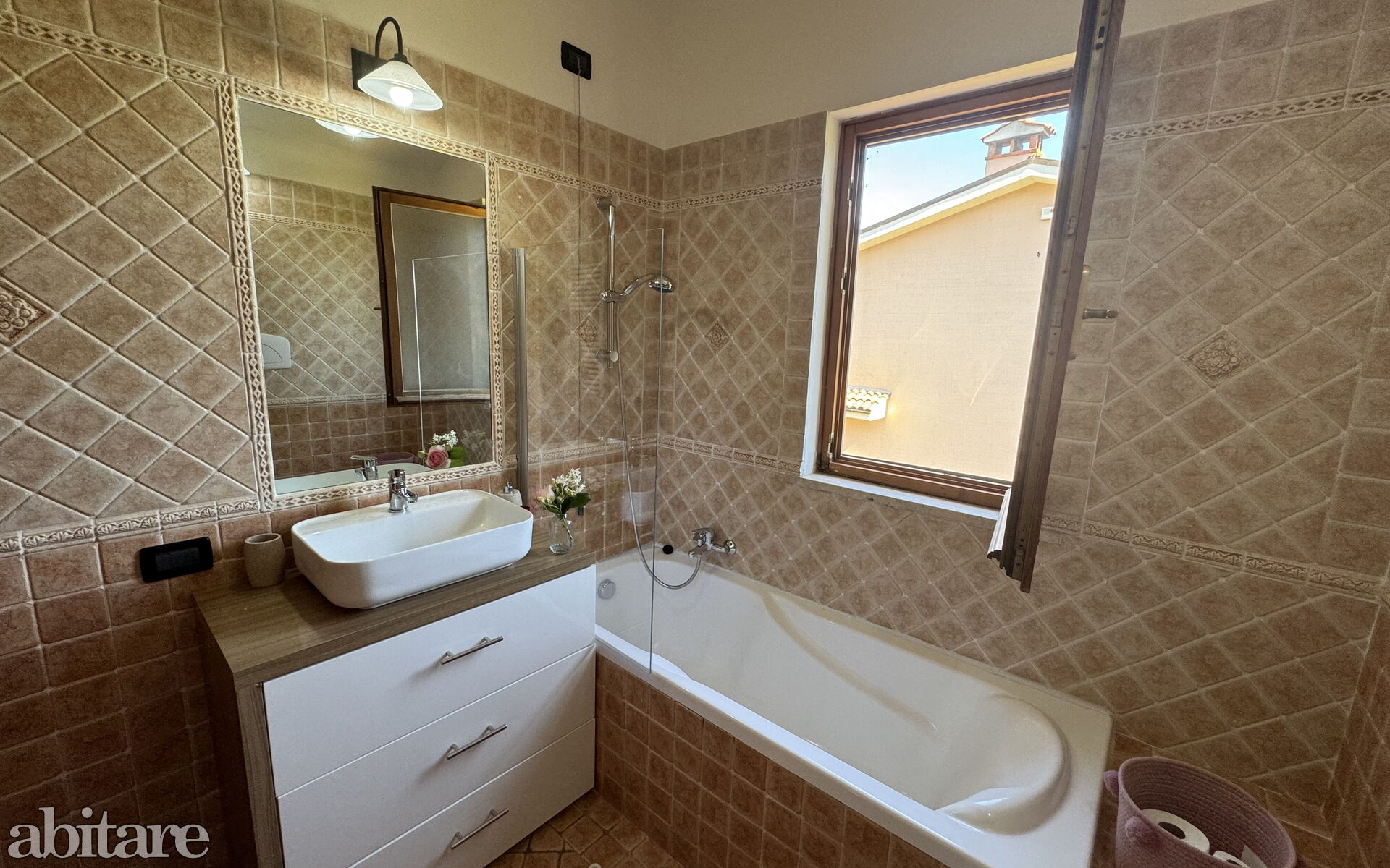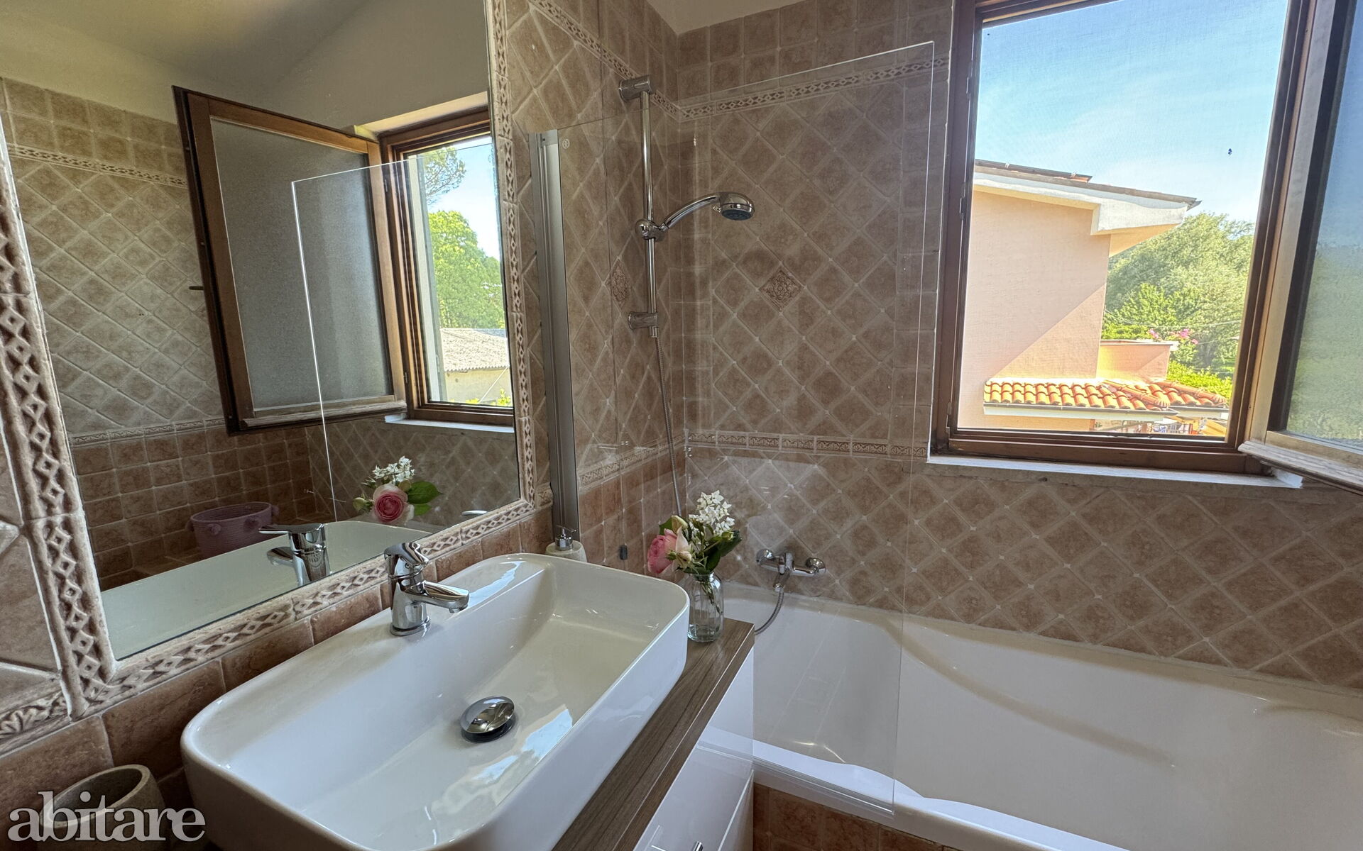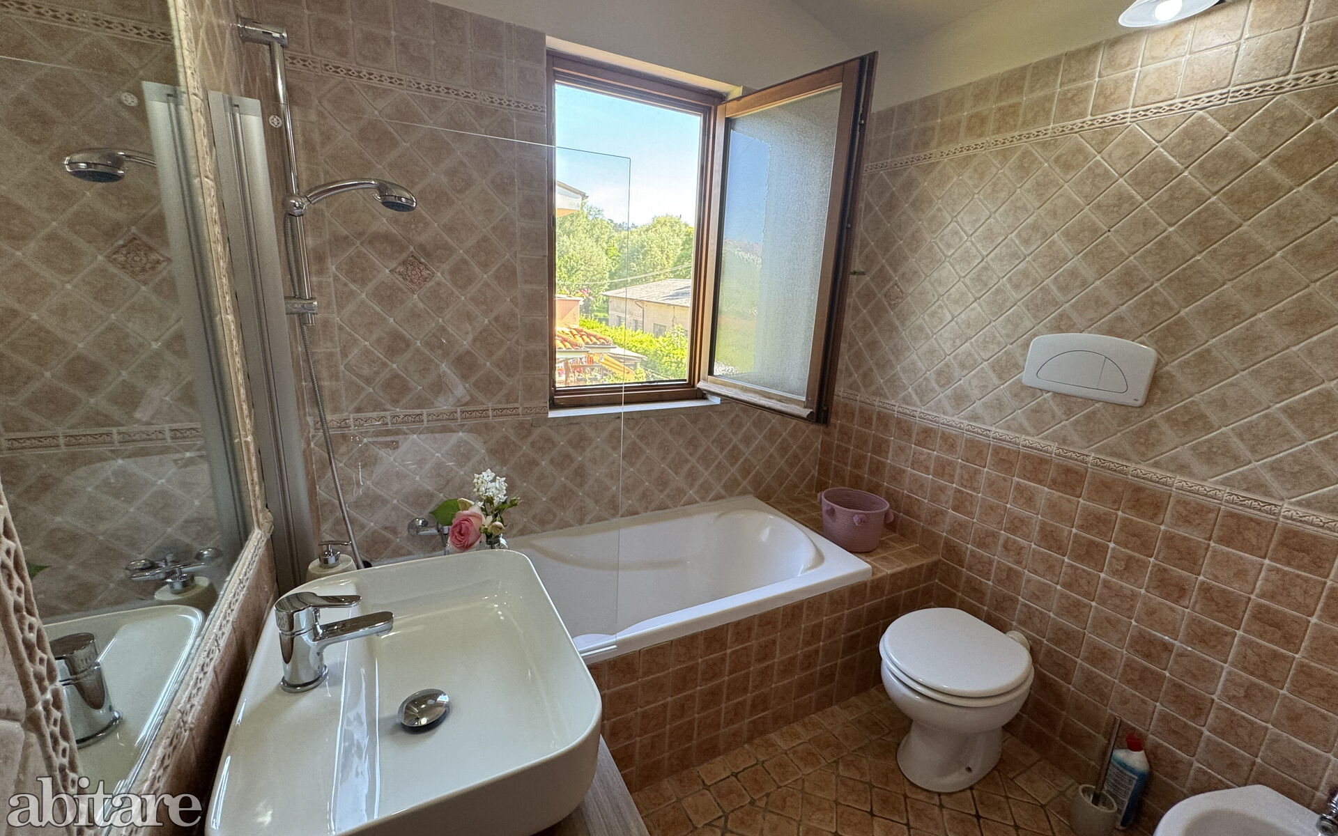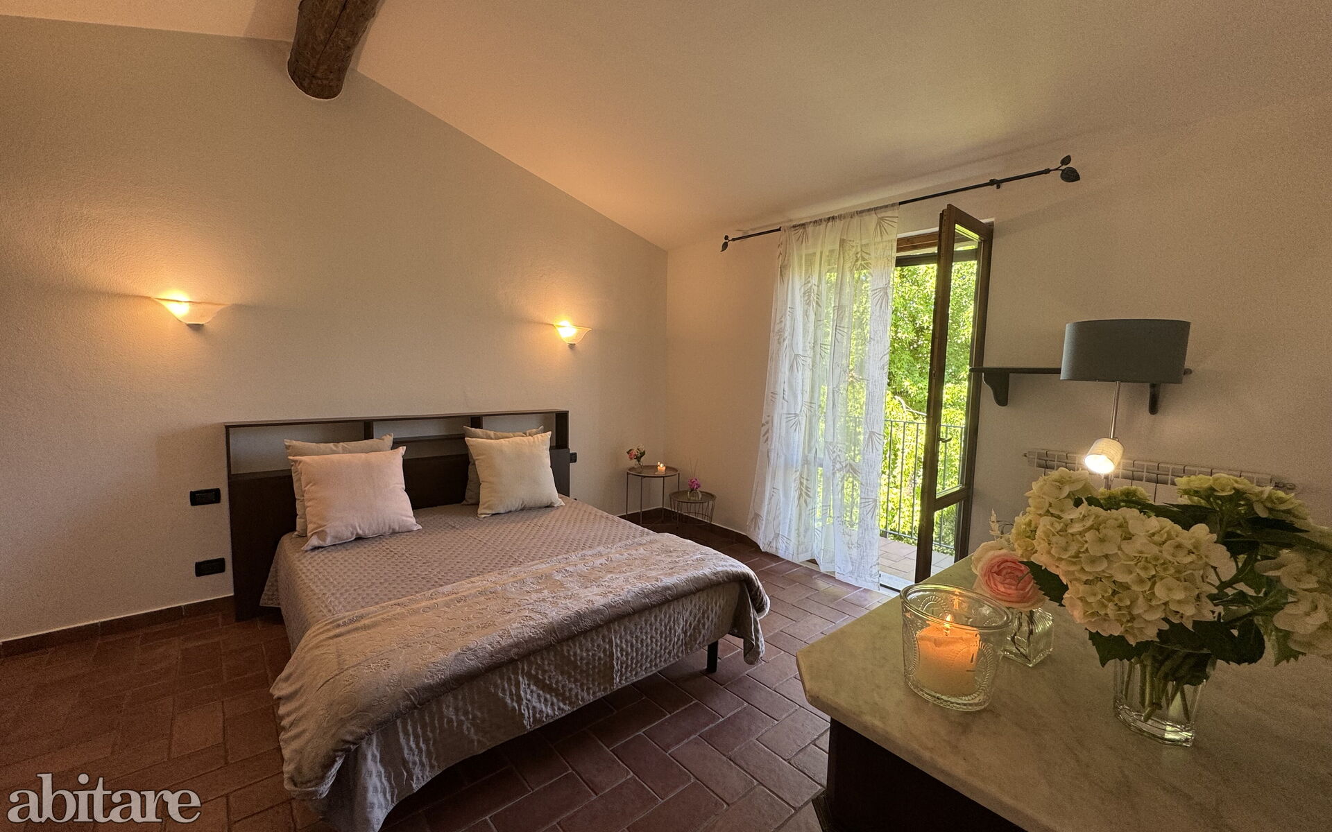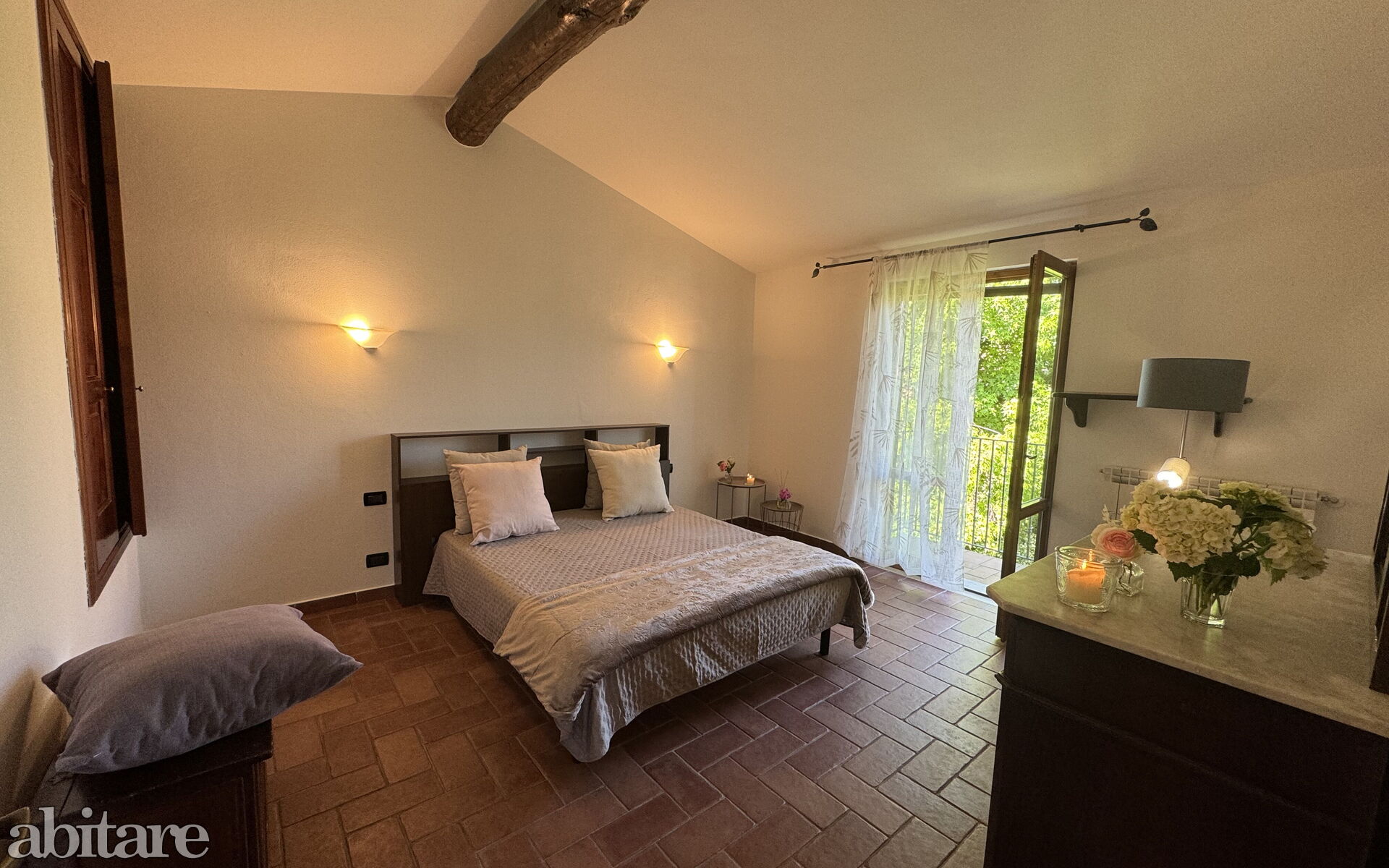 First floor: 1 bathroom with basin, toilet, bidet, bathtub/shower, 1 bedroom with French bed (1.40 m), 1 spacious double bedroom with exit to the balcony.