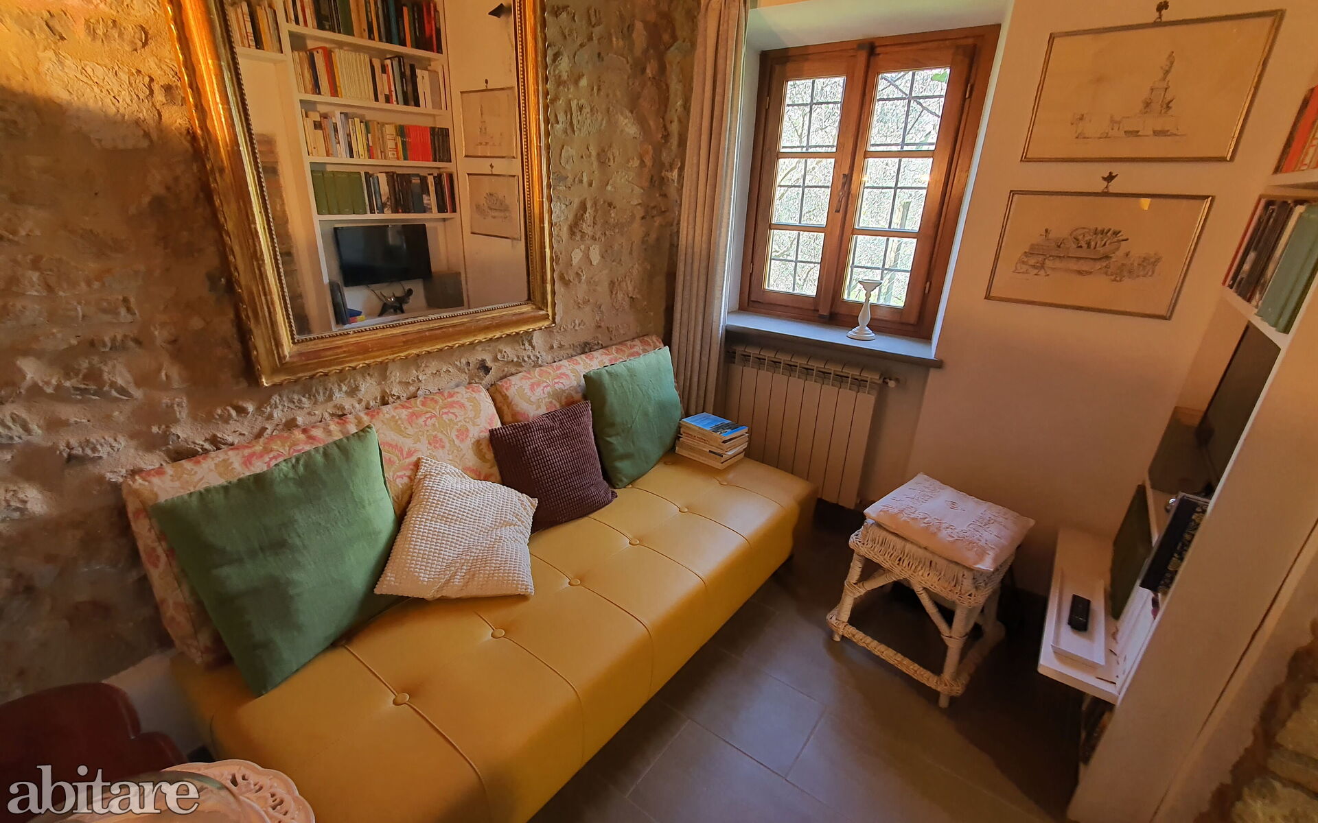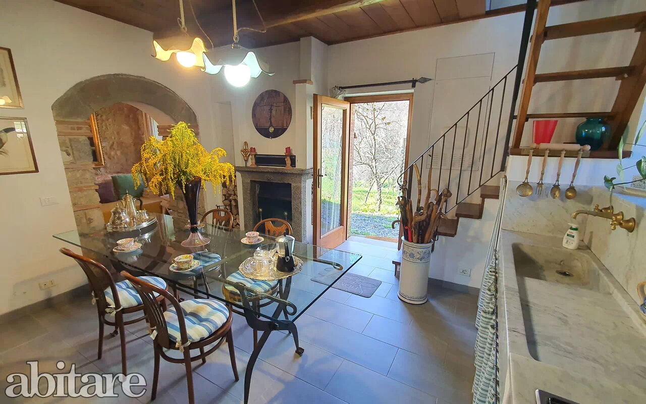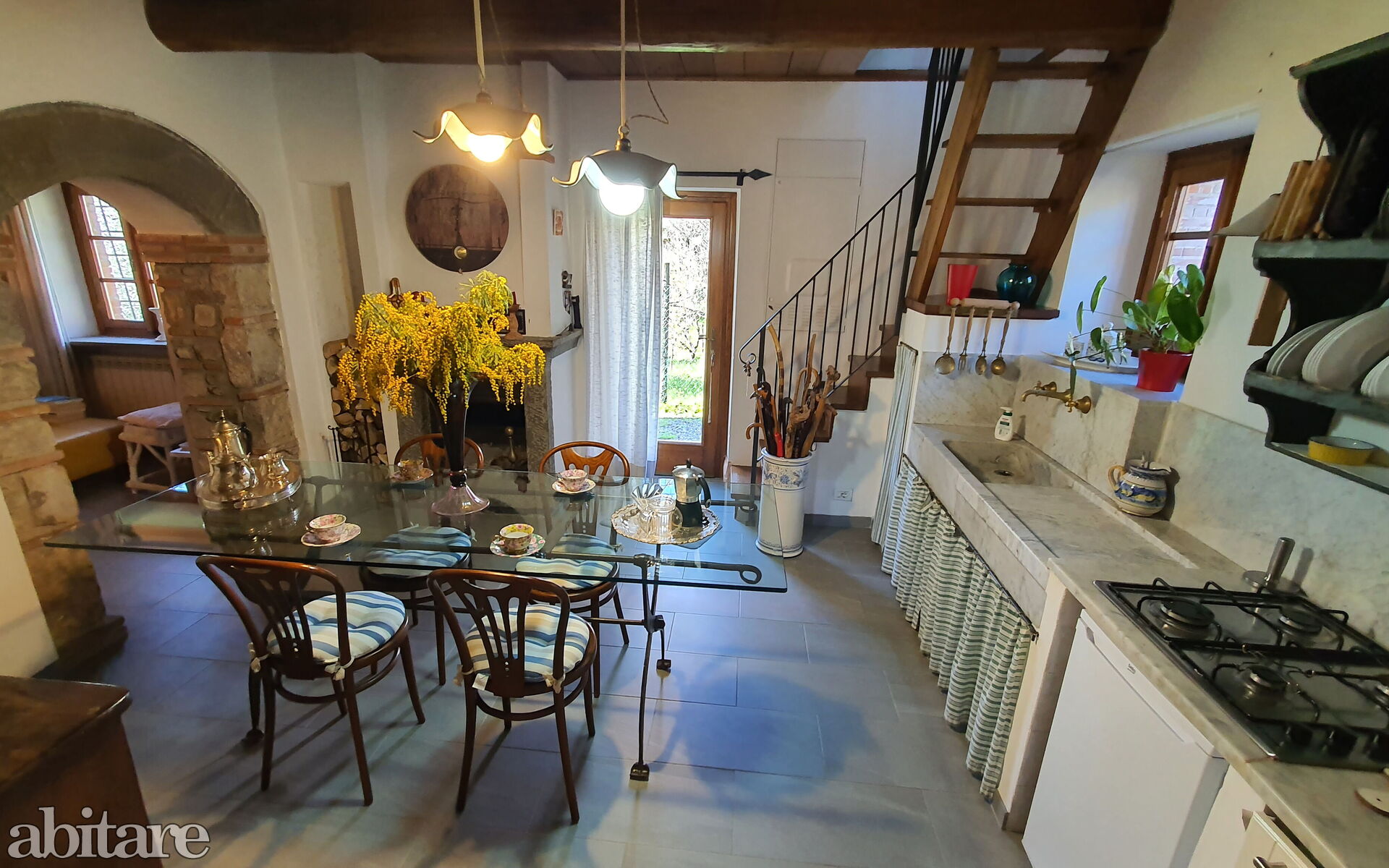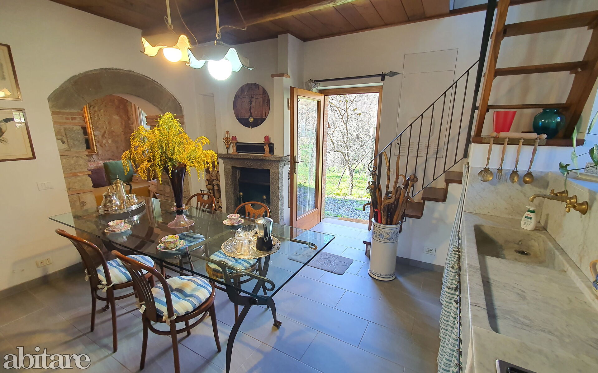 Il Cantuccio 1 consists of: entrance on the ground floor, dining room with a big crystal table, fireplace, kitchen with small fridge, separate freezer, stove with 4 burners, toaster, filter coffee brewer, exit to the garden, living room corner with sofa and TV.